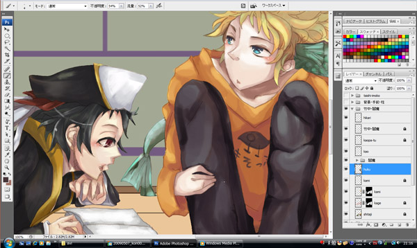 今4人目がほぼ描き終わったのでこちらにUP。調子にのって背景も全部に細かく模様やら文字やらいれていたら、ここまででかなり大きなメモリーの絵に;このままいったらギガいきそうです~