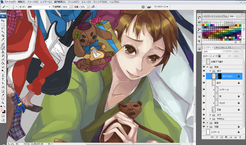 今4人目がほぼ描き終わったのでこちらにUP。調子にのって背景も全部に細かく模様やら文字やらいれていたら、ここまででかなり大きなメモリーの絵に;このままいったらギガいきそうです~