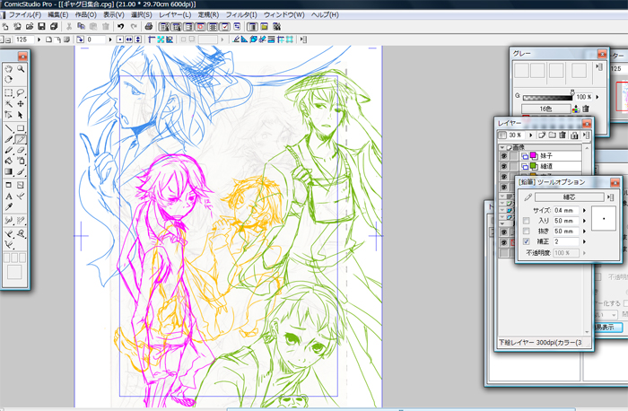 今描き始めた集合絵もってきました!先日UPしておいた落書きは、とりあえず3枚目のみ清書してみました。けど、急に集合絵が描きたくなりまして(笑)予定では飛鳥・細道・天国組の子達をぎゅうぎゅうに詰め込んでみるつもりです。コミスタのおかげでSAIがなくても綺麗な線がかける事実に今更気が付いたんですよ(遠い目)