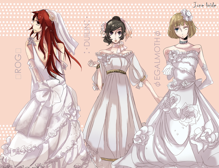 ログのドレスはとりあえず背中ががばっと大きく開いてるというデザインで!といっていたので大きく開いてます。ドゥイリンはチューリップーということだったんですが、個人的にうちのドゥイリンは寒いの苦手、ふわふわしたもの好き。腰で切り替えし嫌いというせっていがあるので、ふわふわしたドレスをチョイス。一番描いていて楽しかったのもドゥイリンだったり。 エガルモスにいたっては、もともとカラードレスにしようかと悩んだ末に出来たので、やたら花の飾りが多いです。豪華に見えて色のおかげで少し落ち着いた感じにはなったかと・・・?
